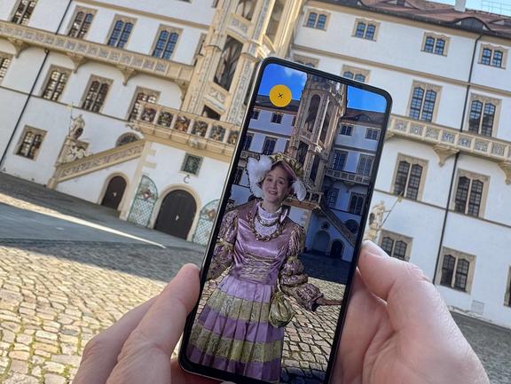Sibylle wird mittels Augmented Reality (AR) auf dem Bildschirm zum Beispiel in den Schlosshof projiziert. Dazu muss in der Schlösserland-App zunächst „Schloss Hartenfels“ und dann das Erlebnis „AR-Avatar Sibylle“ ausgewählt werden. „Wir haben die Wintermonate genutzt, um gemeinsam mit dem Schlösserland diese digitale Neuerung zu erstellen. Damit erweitern wir unser Angebot um eine zeitgemäße, informative und unterhaltsame Vermittlungsform”, sagt Lydia Klöppel vom Kulturbetrieb Schloss Hartenfels des Landratsamtes.